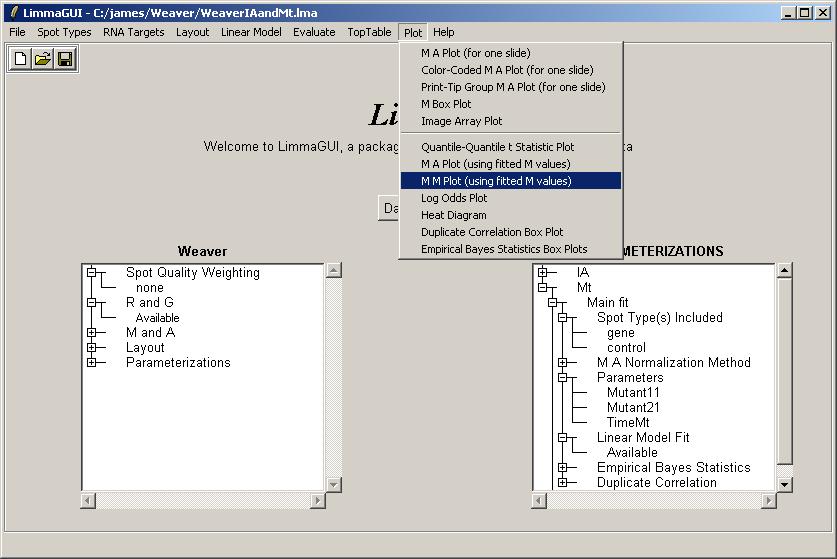 Open the file, WeaverArraysLoaded.lma. This file can be downloaded from the URL given above. Advanced users may be interested to know that a Limma (.lma) file is really just an RData file, so it can easily be loaded into an R session. However, it may appear more complicated than standard RData files associated with the limma package because it allows for multiple parameterizations and stores them in a list data structure.