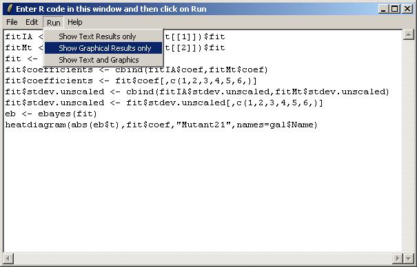 This feature has not yet been implemented in a point-and-click way, but we will demonstrate how to combine the results of the two parameterizations and plot a heat diagram, using the "Evaluate" menu. Click on "Evaluate R Code" from the "Evaluate" menu.