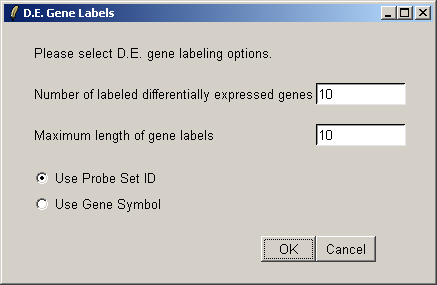 Use the probe-set IDs to label the top-ten most differentially-expressed genes, as we don't have an annotation package for this chip, so we can't use Gene Symbols.