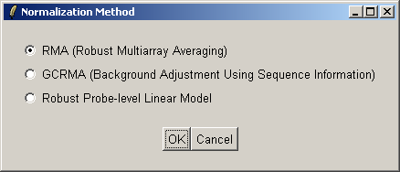 Select "RMA" as the normalization method. For this to work, you must have the CDF packge installed in R.