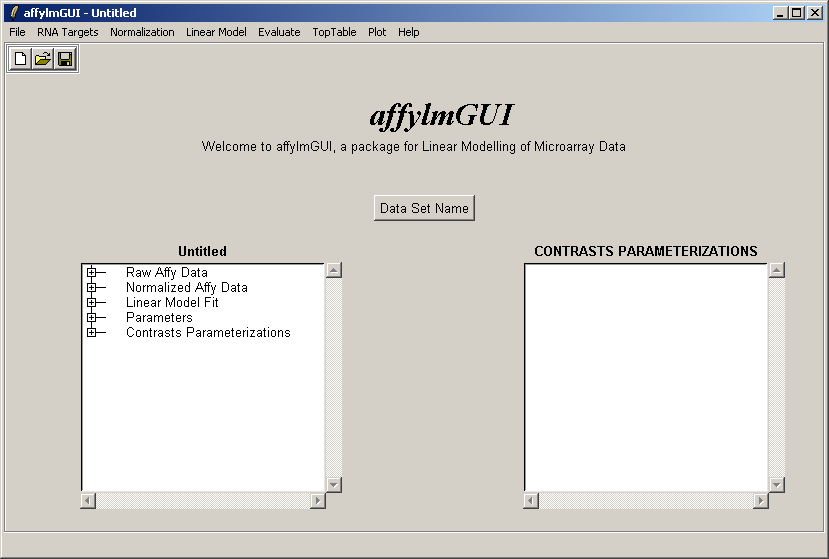 To begin using affylmGUI, you will need to create an RNA Targets file, which is a tab-delimited text file with three columns: Name, FileName and Target: