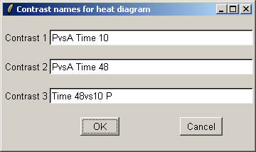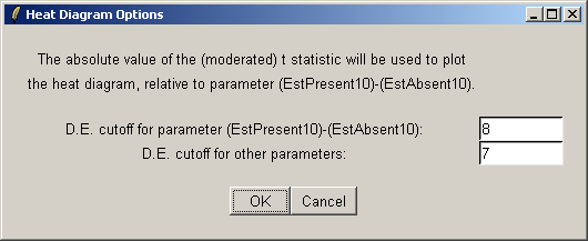 The heat diagram only displays a subset of genes. You can choose a cutoff based on the t statistic to define a set of differentially expressed genes. The primary cutoff is for the contrast selected in the last dialog, and the secondary cutoff is for the other contrasts.