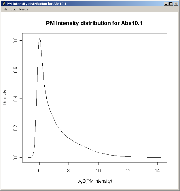 The density curve above shows the distribution of Perfect Match (PM) intensities across the first chip.
