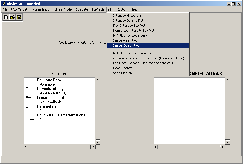 The left status window now reflects the fact that normalization is complete. For users who are familiar with some R commands, the raw and normalized data objects are available as "RawAffyData" and "NormalizedAffyData" in the "Evaluate R Code" window, found in the "Evaluate" menu.