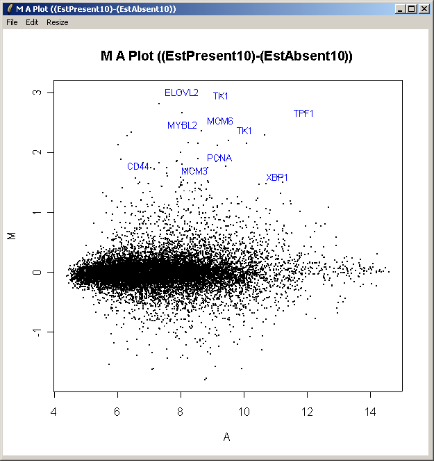 The resulting plot is shown above. This shows the relationship between the B statistic (log odds of differential expression) and the log fold change (M). Unlike the log fold change, the B statistic takes into accound the variability between replicate arrays.