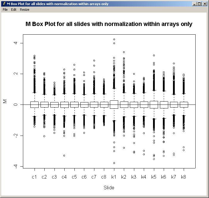 The M box plot is shown below. As there is not much difference in scale between the different arrays, we won't normalize between arrays for this data set.
