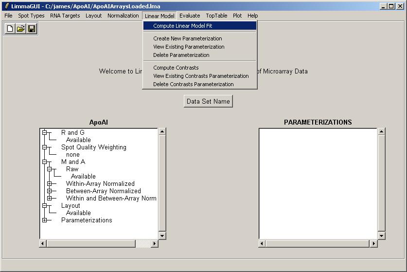 We will now compute a linear model for this set of arrays. As we have three types of RNA (Reference, Wild Type and ApoAI Knockout), we can estimate two parameters from the linear model (i.e. one less than the number of RNA types). The parameterization has already been created and loaded in ApoAI.lma. Click on "Compute Linear Model Fit" from the Linear Model menu.