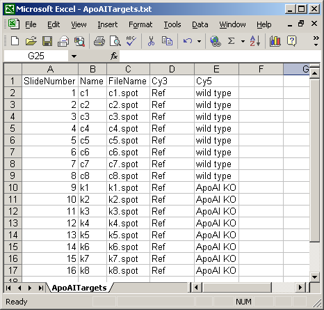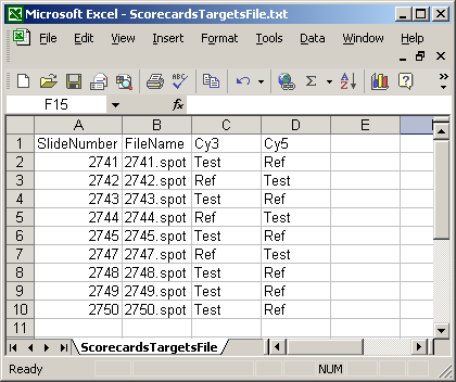 The ImaGene Targets file below shows the special case of the ImaGene image-processing software which gives two (tab-delimited text) output files for each slide, one for the Cy3 (Green) channel and one for the Cy5 (Red) channel. So instead of having a single FileName column, there are two file name columns: a FileNameCy3 column and a FileNameCy5 column.