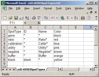 Every Spot Types file must have a SpotType column, for which each entry should be unique. It must also have an ID column, a Name column and a default Color column. The rows of the SpotTypes file should be read as a list of rules (in order) for defining spot types. The first rule usually specifies that every spot is a gene (or cDNA), then subsequent rules reclassify certain spots (controls, blanks etc.) according to what is found in the ID or Name column of the GAL file. Because these rules are applied in order, it is best to begin with spot type rules which describe large numbers of spots, followed by rules describing more and more specific spot types. For example, consider the effect of swapping the order of the two rules “1. Everything is a gene” and “2. Everything with ‘scorecard’ in the ID column is a scorecard spike-in control.”. If the more general rule (the first one) was applied after the more specific rule (the second one), it would overwrite the results of the more specific rule, so for this reason, more general rules should be in the top rows of the SpotTypes table.